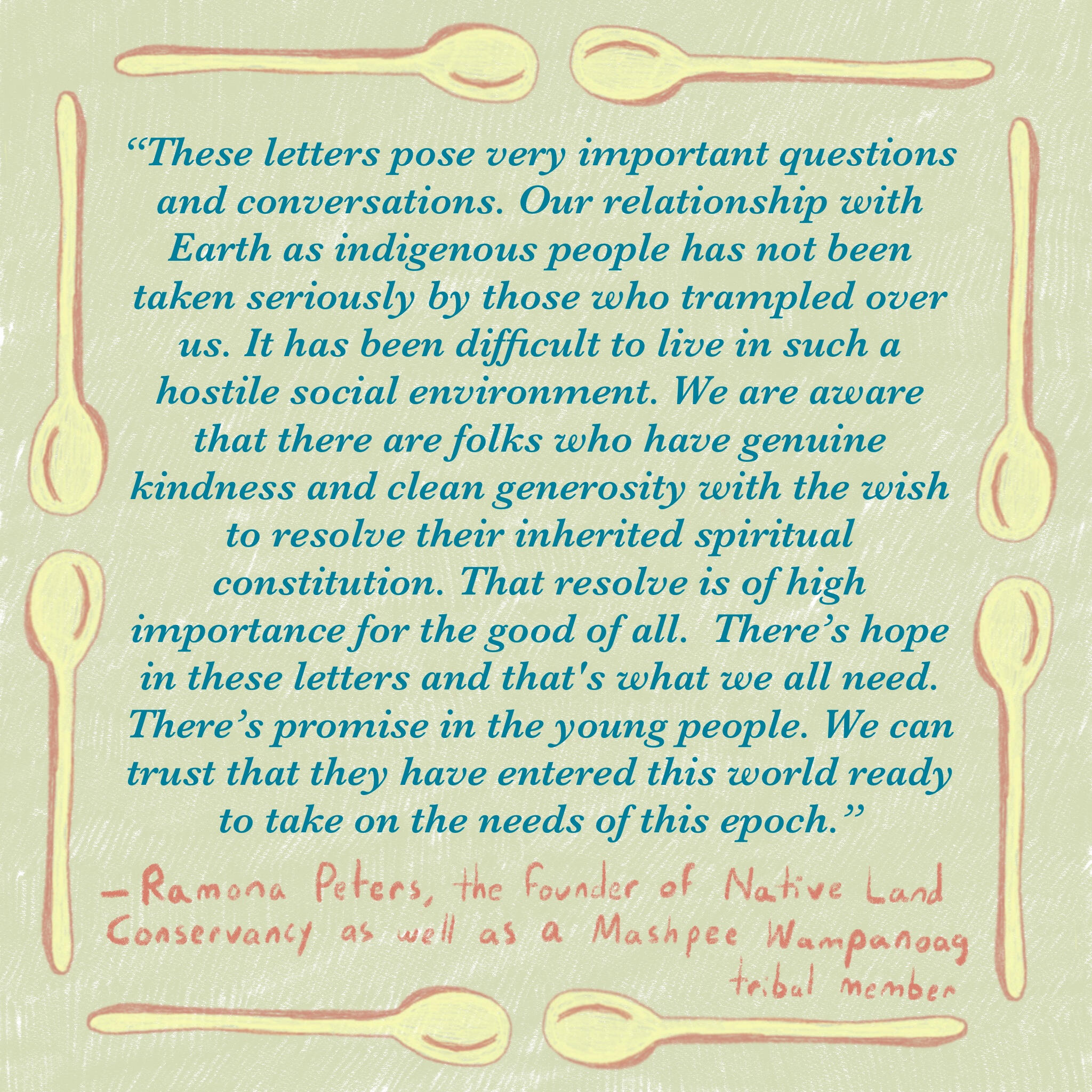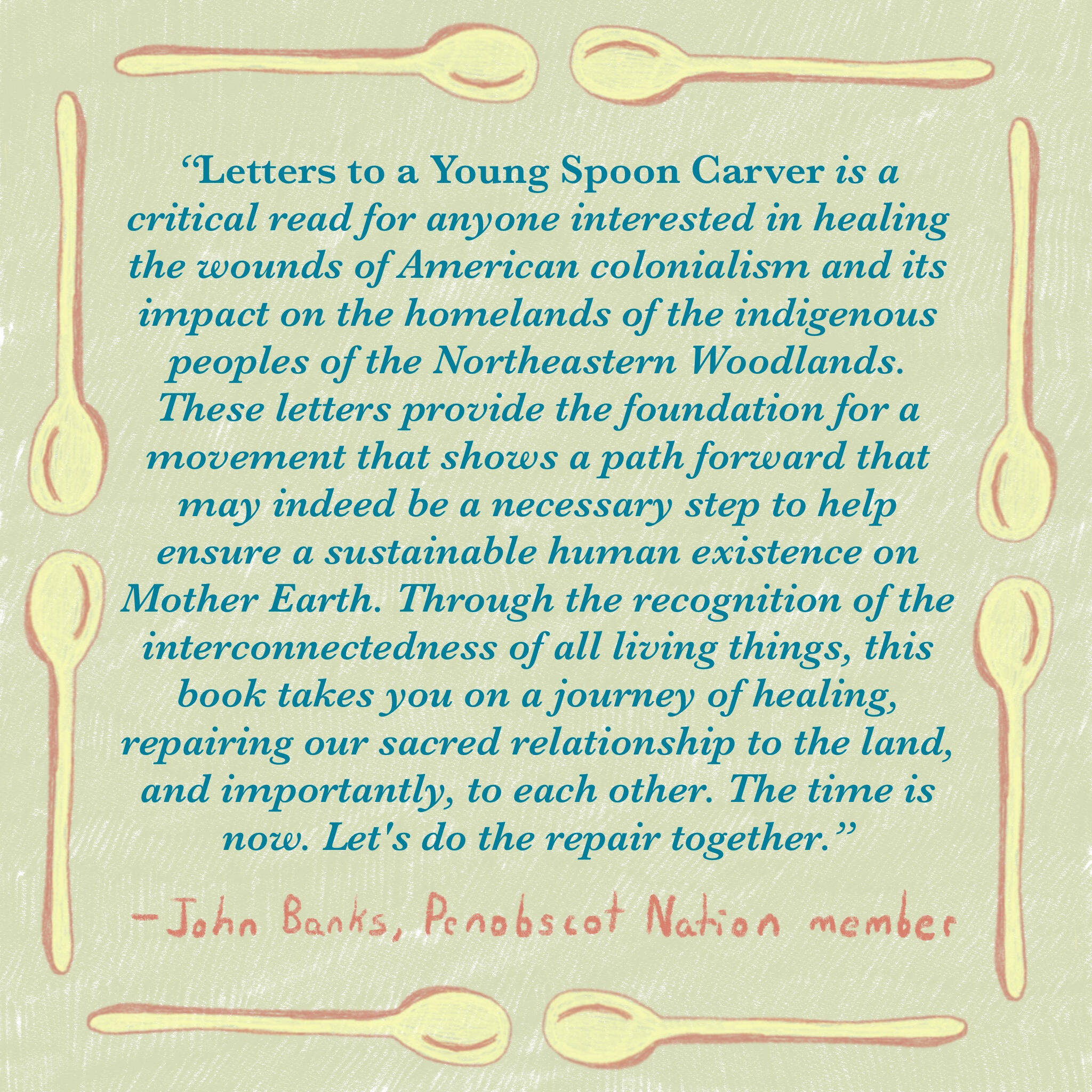 "The work is relational and generational. How we carry ourselves it in is what matters most. To repair is often the best thing humans do. This is healing work that we cannot do separately. But if we are brave and careful enough, land can also be a place of repair. It’s futile to try to protect nature without beginning with the task of healing ourselves. This is the power of relationships, the evidence that we never exist alone, and that our relationships form our potential. Our collective thriving is contingent upon making this repair." - Peter Forbes, Letters to a Young Spoon Carver
